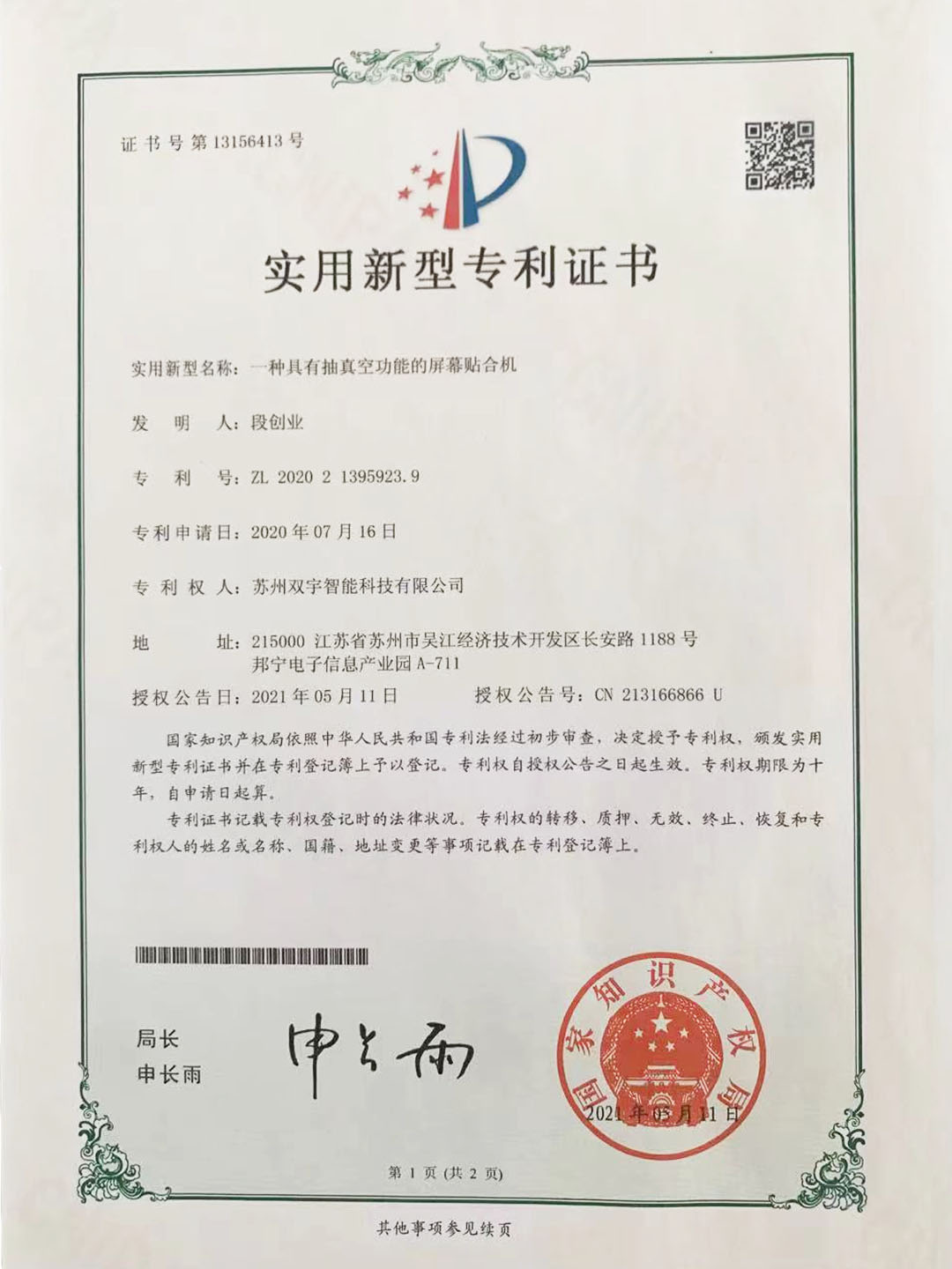 蘇州雙宇智能科技有限公司成立于2015年,是一家專業(yè)做液晶屏幕全套生產(chǎn)設(shè)備的研發(fā)、設(shè)計(jì)、生產(chǎn)、銷售為一體的高科技生產(chǎn)企業(yè)。 公司擁有自主研發(fā)的核心技術(shù),可以根據(jù)客戶的具體工藝特點(diǎn),提供一整套解決方案,并支持工藝轉(zhuǎn)型的設(shè)備優(yōu)化改良服務(wù),讓設(shè)備最大限度的發(fā)揮作用,有效降低成本。 專業(yè)生產(chǎn)真空貼合設(shè)備、CCD自動對位全貼合線設(shè)備、高壓除泡設(shè)備、自動覆膜及相關(guān)自動化設(shè)備。 從設(shè)計(jì)到組裝到銷售再到售后,擁有一支專業(yè)的團(tuán)隊(duì)為客戶提供專業(yè)的服務(wù)。我們一如既往的秉承“客戶至上,技術(shù)領(lǐng)先”的經(jīng)營理念,用高質(zhì)量的產(chǎn)品,良好的信譽(yù),優(yōu)質(zhì)的服務(wù),竭誠與客戶合作雙贏,共同發(fā)展,共創(chuàng)輝煌!